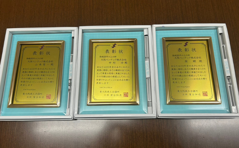 勤続20年の部で 中村 功、山本 有一、周 剛 の3名が表彰されました。